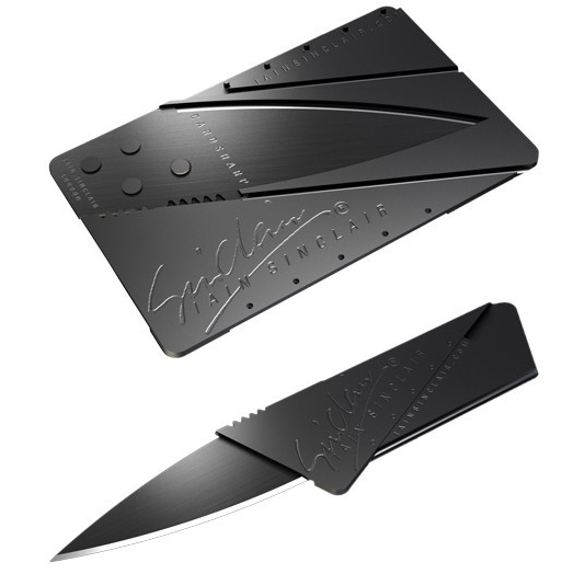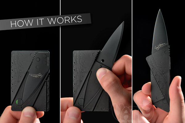 - Blade edge is protected when stored in wallet or kit bag; Protective hilt appears when open